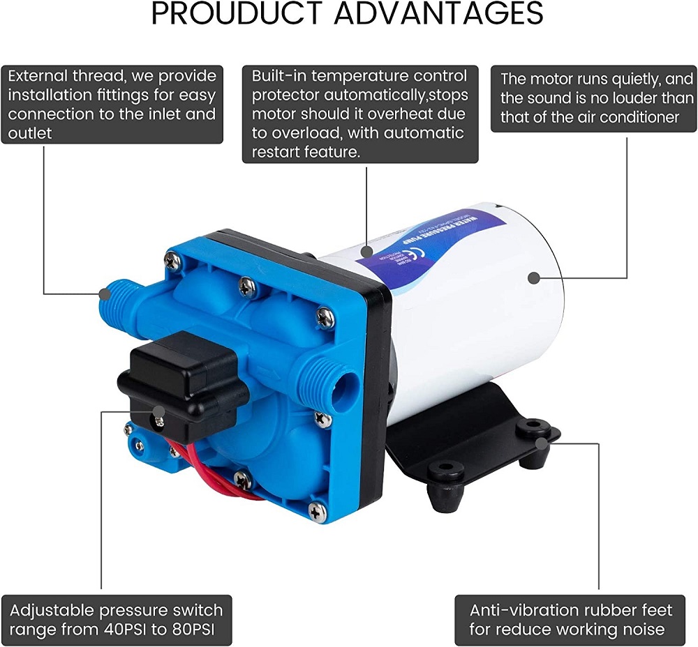 The pump could be widely using for RV, Boat, Water supply and Irrigation